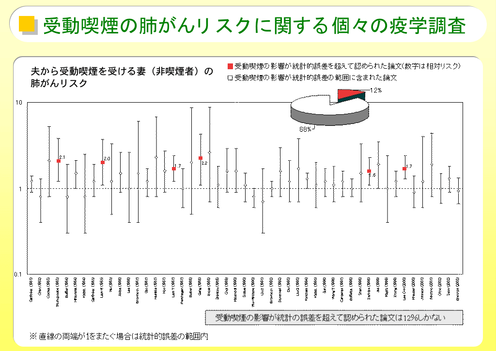 夫からの受動喫煙を受けた非喫煙の妻の肺がんになるリスクに関する疫学論文は、1981年から2003年までに49報ほど、発表されています(平山の論文もこの中に含まれています)。しかしながら、その実態は、図1に示しましたが、受動喫煙の影響が統計の誤差を超えて認められた論文(受動喫煙の影響が認められた論文)は、12%(6報)しかなく、88%(43報)の論文は、統計の誤差の範囲内(受動喫煙の影響が認められない論文)でした。図1において、オッズ比「1」をまたいでいる場合が統計の誤差の範囲内であり、オッズ比「1」を超えて大きい場合が統計の誤差を超えて受動喫煙の影響が認められている場合を示しています。つまり、図1は、受動喫煙による肺がんリスクは大部分の論文で認められていないということを意味しています。