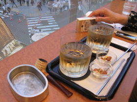喫煙中に、他のお客に気を使わなくてよいので、心から喫煙をエンジョイできるのは有難い限りです。 最近では、禁煙の焼き鳥屋とか、禁煙の鰻屋とかもありますが、そもそも焼き鳥や鰻を焼く時の煙で燻される環境の店にもかかわらず、たばこの煙だけを拒否するという発想は理解に苦しみます。 「カフェトバコ」は、東京駅付近にもあるようですが、今後、この種の「全席喫煙可」の飲食店が新たにオープンする傾向にあると思われます。また、「プロント」においては分煙でありながら、喫煙席の数を増やす傾向にあるようです。京急羽田空港駅店(第二ターミナル口)では大きなシガーのイラストと共に「喫煙席あります」と手書きの黒板があり、京浜急行第1旅客ターミナル口にある全面禁煙の「スターバックス」とは好対照です。愛煙家諸氏は、できるだけ利用して、このような店がつぶれないように支援しましょう。 |