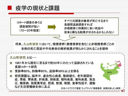 これまでに引用されてきた疫学データは、10年―20年程度の短期間のものが多いが、ここに紹介する久山町研究のような長期の疫学研究(約50年にわたる長期コホート研究)の結果が公表されることを期待したい。人間の死亡率は、最終的には100%なので、喫煙の有無にかかわらず、人間は何らかの死亡原因によって死に至るものである。