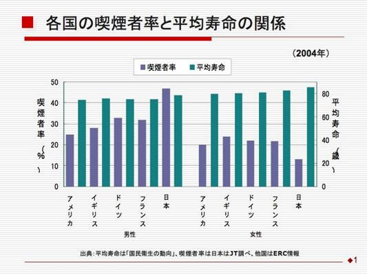 各国の喫煙者率と平均寿命の関係を見ても、男性喫煙者率の高い日本の平均寿命が他の先進国の平均寿命よりも高く、かつ、日本の平均寿命は徐々に伸長する一方となっている。