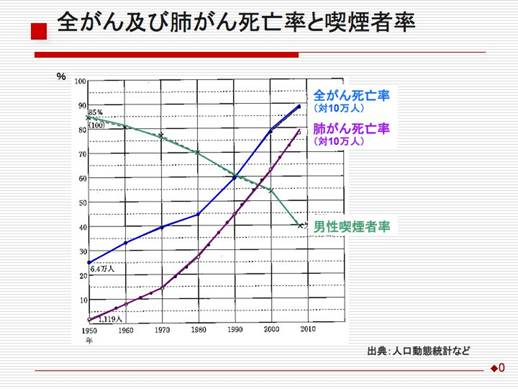 上述のごとく、男性喫煙者率が低下の一途である日本において、がん死亡率も肺がん死亡率も上昇の一途であり、平均寿命も徐々に伸長していることから、喫煙と関連死亡数との関係は一概に断定できず、慎重に考えなければならない問題である。 |