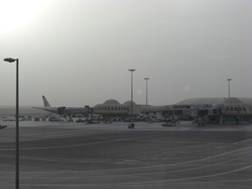 陽が昇ってくると気温もどんどん昇っているのが感じられる。未明の午前3時過ぎに空港外の気温は摂氏35度。朝7時頃には40度近くなっている。この日の最高気温の予想は45度とか。窓から外を眺めると東の方向の砂漠地帯に靄がかかっている。どうも砂嵐のようだ。空港内の建物内は冷房がよく効いていて快適だが、外は暑くて大変だろう。