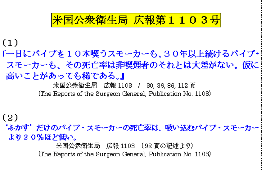 ![]() このサイトで度々指摘されているが、嫌煙・禁煙運動の論調の多くは、膨大な喫煙に関する論文の都合の良い部分のみを取り上げているに過ぎない。厚生労働省の発表も矛盾に満ちたものだが、これは矛盾に満ちたWHOのヒステリックな勧告の受け売りに過ぎない。WHOの勧告を隠れ蓑に、自らの過去の発表にほおかむりをしようとするものであろう。喫煙率が現在より高かった時代に、当時の厚生省(2002)は、 先進工業国で喫煙率が最も高いわが国では肺癌罹病率が最も低く、半分ほどであることを発表した。ところが今は、タバコのパッケージには‘肺癌に罹る恐れ’を強制的に書かせているのである。 そもそも、WHOはエイズ、エボラ熱、サーズなどに対する後手後手の対応に対する批判をかわす意味もあって、新型インフルエンザなどの対応ではむやみに恐怖感を煽るだけである。これに便乗しているのが多くのマスメディアである。神奈川県知事がマスコミ受けを狙って発表する愚かな政策も同様である。自らの失策を、外敵を作ることで隠そうとするのは、後進国の常套手段である。 上に掲げたのは、嫌煙・禁煙運動のキッカケとなった米国公衆衛生局の広報(1964)からの抜粋である。387頁におよぶ長大なこの広報に改めて目を通してみると、上掲の(1)の記述は何度も繰返されている。45年も前の広報でありながら、米国公衆衛生局のこの広報1103は依然として、嫌煙・禁煙運動のバイブル的存在である。今でも、PDF版をダウンロードすることが出来る。 先に挙げた神奈川県知事ばかりでなく、多くの自治体の禁煙の動きは喫煙全てを“悪”ととらえ路上禁煙まで押し付けている。そもそも、路上禁煙は混雑した路上で 上掲の米国公衆衛生局の広報はパイプ喫煙に関しては、葉巻も含めて極めて肯定的な結論を出しているが、これがほとんど無視されていてタバコ喫煙が全て同等に扱われてしまっている。各所に貼られている禁煙マークにはシガレットしか描かれていないにも拘わらずパイプも禁止されるのである。 パイプを銜えて歩いていると、禁煙監視員から注意を受けることがある。環境問題だと云う。問題のすり替えである。副流煙の害なぞは、WHOはかって「因果関係は認められない」と発表したことがある。しかし、マスコミの多くはこれを闇に葬ってしまった。喫煙と喘息の関係は、この米国公衆衛生広報が否定している。 筆者は幼少のころから、喘息を患っている。主治医は、「タバコを止めろ」と云う。筆者が「パイプで喘息を抑えているのだ」と云うと黙ってしまう。 上掲の広報1103の(2)は、「‘ふかす’だけのパイプ喫煙は吸い込むパイプ喫煙より死亡率が20%低い」とするものだが、(1)でパイプ喫煙愛好家の死亡率は非喫煙者と同じように低いとすることから、‘ふかす’だけのパイプ喫煙者は非喫煙者より死亡率が20%低いということにはならないだろうか? 確かに、86歳の長老がパイプスモーキング選手権で9回も優勝したり、筆者が属する銀座のパイプクラブでは94歳まで永世名人の地位にあった会員がいたり、95歳で例会に欠かさず出席する会員が在席していたりで、パイプ・スモーカーの間では老年パワーは極めて顕著である。 しかしこの広報では、ごく短く「パイプ・スモーカーで吸い込む喫煙者は稀である。」とする記述があり、これを見逃すと上のような結論になる。嫌煙・禁煙論者が繰り広げる論理には、この手の詭弁が多すぎはしまいか。 路上・海岸を含め、環境問題などとする詭弁で屋外禁煙を科するのは、海外では極めて稀である。膨大な量の排気ガス対策に手をこまねいていたのが、ハイブリッド車や電気自動車などが出てくるとタバコに矛先が向けられることになる。排気ガスに比べ極めて微々たる煙しかださないタバコ喫煙である。 しかし、自動車の環境問題は本当に解決するのだろうか?ハイブリッド車は、ガソリンを燃やした発電でモーターを回すだけである。電気自動車は、充電したバッテリーでモーターを回すのだが、日本の発電の60%以上は石油を燃やしているのである。核燃料発電の増設はママならず、発電用ダムの建設を止めさせてしまう政府を持つわが国で、完全なるクリーン・エア排出を標榜できるのはバイオ燃料車と燃料電池車のみであろう。しかしこれはまだ前途多難である。 筆者が知人にパイプ喫煙を薦めるときは、「少しは賢くなりたかったら、健康的なパイプを始めろ!」と云うことにしている。 |