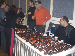 ワールド・カップ前日から会場とのプリバルチスカヤ・ホテルの2階宴会室で、パイプとパイプ煙草のワールド・ショーが開催され、パイプ作家とパイプメーカーの約30社がご自慢のパイプを展示即売していて、大盛況だった。デンマークの有名なパイプ作家の作品6本は、瞬間蒸発で売り切れたと聞いた。大会使用煙草を提供した米国コーネル&ディール社は、宣伝も兼ねて試供品を配りまくって、大人気だった。ちなみに、大会使用煙草は、バージニア葉主体のいかにもアメリカらしいパイプ煙草で、欧州のラタキアなどのこってり系の葉が好きなパイプ党がどう受け止めたかは分からないが普通の日本人パイプ党の私は、昔から馴染みのあるハーフ&ハーフにコクを加えて味をドライにした感じで、病み付きになる美味さだなと感じた。 ![]()