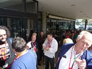 ラテンのお国柄ですので、どうせ開場は遅れるだろうと思って、入場時刻の午後1時半は無視して競技開始時刻の午後2時半近くまでレストランでゆっくりと食事。悠然と遅刻気味に乗り込んだつもりでしたが、着いてみると大勢の参加者が場内に入れず、パイプショウが開催されている隣の控え室で、わいわい騒いでいました。立錐の余地もないという混雑振りです。