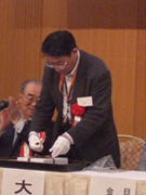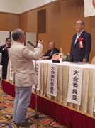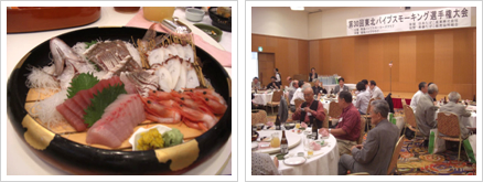 6位以内入賞者のパイプチェックが済んで、順位が確定したところで、隣の懇親会会場に移って盛大な懇親会。大会副実行委員長の清水愛郎盛岡PC副会長の挨拶、梶浦恭生PCJ会長が「たばこを巡るこのところの悪しき風潮を吹き飛ばそう」と元気に大会講評。次回第31回大会を主催する山形霞城PCの大久保義彦会長の発声で盛大に乾杯した。