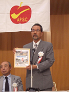 「飛鳥」を提供して下さった蒲池光JTアイメックス社長が来賓挨拶で、高級パイプたばこの飛鳥の商品説明の中で、「今回提供した飛鳥は、パウチではなく缶なので、かなりの湿度があり、着火失敗に注意を」と呼びかけた。蒲池社長は、大津波被災地の廃墟の中で昨年5月に高々と翻ったたばこ販売の幟(のぼり)のパネル写真を見て感動した話も披露して、会場内に共感の輪が拡がった。