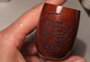 風晴晃大会審判長(青森PSC副会長)の大会ルール説明を経て、いよいよ使用たばこ3グラムが配布となり、選手宣誓に続いて5分間のたばこのパイプ詰め作業。使用パイプは柘製作所製。ボウル前面に青森ねぶた祭りの武者絵の図柄がレーザーカットで大きく掘り込んであり、いかにも青森での大会らしい。