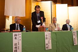 挨拶の中で、記念大会恒例の連続出場者の表彰にふれ、全40回連続出場者に皆煙賞、第1回〜第3回大会に出場し、今回出場されておられる80才以上の方に精煙賞を贈呈することとし、皆煙賞に村上征一さん(JPSC・76才)、精煙賞に関口一郎さん(JPSC・99才)、内田昇さん(千葉・84才)、大野智英さん(関西・83才)が授賞されると発表した。また今回の優勝者は来年ドイツのケルンで開かれる第13回世界大会の連盟代表選手として派遣すると説明、全ての参加者にそのチャンスが開かれていると激励、健闘を祈念した。