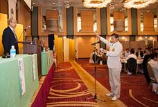 表彰は齋藤義嗣第四十回記念大会実行委員長にバトンタッチされ、挨拶の後、数々の特別賞が手渡された。遠来賞は北海道紫煙会札幌が一番乗り賞とともに手にした。飛び賞などなどで思わぬ賞を手にして喜ぶ人がいるのもいつみてもほほえましい風景だ。第40回。10月6日の開催日にちなんだ40分賞、106分賞もあった。最後は、たばこ総合研究センター編纂の分厚い「たばこ事典」3冊をジャンケン大会で分け合い表彰式を終了した。
