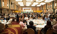 準備に一息ついてから懇親パーティと表彰式に移る。パイプショウ参加者や応援をふくめ約300名が集まり、大ホールも一杯となった。先ず始まったのはハッピィ吉澤一座による歌舞伎仕立てのマジックショウ、軽快な手芸が次々と披露された。それから乾杯、音頭に立たれたのは千葉PSC会長の内田昇連盟副会長。内田さんは37回退会まで連続出場されていた。その後病に伏されたが、不死鳥のごとく蘇って出場された。「40回は1回1回の積み重ね、それぞれの大会を積み重ねた先輩たちと、協賛くださる皆さんへの感謝の言葉を贈りたい」と挨拶されて乾杯した。