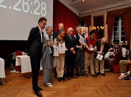 いよいよ着火で競技開始。イタリアはタンパーを使う時だけパイプを口に持って行くが咥え続けることはない。ボウルの上から火を眺めて眉を寄せ、人生に疲れたような顔をしてため息を着いている。そしてタンパーの先をこすり続けていっぱいに灰の跡がついた紙を変えろと審判に要求する。そこで審判が予備の紙をちゃんと所持しているのには感心させられた。自分も暇なので敷紙にタンパーを押し当ててマーキング、他の卓ではタンパーを叩きつける甲高い音がするが、この卓はこするだけである。残るは件のイタリアと自分だけ、80分を超えた当りで煙道の通りが悪くなり、強めに吹くと灰神楽となり終了、初の海外遠征ということで火を強めにしていたので已むを得ないだろう。順位は30人ぐらい残っているかというところ、中庭に降りて競技の終了を待つ。残りが20人ぐらいで消えた者の記録が中庭に設置されたディスプレイに表示されるようになった。日本チームも1人残っていて健闘している。結果は3人の記録を合わせて301分とまあまあ、国別で3位に入ることができた。