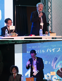 大会はトランペットの演奏から始まり、森谷会長の挨拶「スモーキングを楽しんでください!」その掛け声の後、いつも通りの手順で、競技パイプとルールの説明、テープカット、選手宣誓と続き、柘審判長のゴングの合図で競技が始まりました。半屋外ではありましたが、着火時の煙の立ち昇りは、会場を紫煙で埋め尽くすようで実に爽快でした。この光景を見るだけで大会を開けて良かったと思わせます。