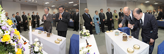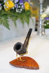 引き続き、ご遺族を代表して、ご長女のご主人森浩三様からご挨拶がありました。故人は、こよなく愛したパイプの世界に打ち込むことで人生の収穫期を充実させ、晩年を素晴らしいものにすることが出来て幸せだったろう、故人はパイプの世界での活動を心から楽しんで喜んでいた、と紹介されました。 小売店を代表して悼辞を述べた東京銀座・菊水の内藤幸太郎社長は、太田さんがお店に現れた時のエピソードなどを披露して太田さんとの別れを惜しみ、各パイプクラブからは岡山パイプクラブの砂山有生会長(代読)が、岡山で全日本パイプスモーキング選手権大会を開催した際の太田さんの懇切な指導の思い出などを語りました。
