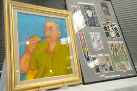 「送る会」の会場の奥の祭壇の正面には遺影が飾られ、周りには太田さんの遺品や長年収集したパイプ、パイプ関連装飾品、多くの写真、本・雑誌の出版物、それに一時凝っておられた千社札がところ狭しと並べられました。祭壇の右手には、昨夏に柘製作所の柘会長が描かれた太田さんの肖像画が飾られており、ひときわ目を引きました。
