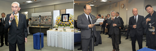 内田昇連盟副会長は、惜別の情を込めて同世代として想い出を語って、献杯の発声。これに合わせて参列者一同、故人を偲んで献杯しました。