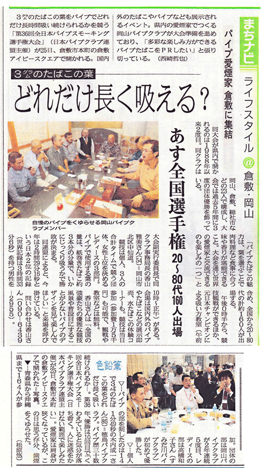 10月25日に倉敷市内で開催した第36回全日本パイプスモーキング選手権大会に関する地元の山陽新聞の記事をご紹介します。(10月24日、10月26日掲載) 当日の大会の模様は、地元のテレビせとうちと倉敷ケーブルテレビの報道番組でも採りあげられました。