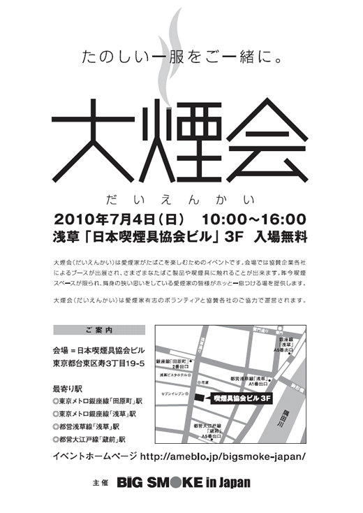 喫煙者なら、いま煙草を取り巻く環境はご存じの通り、閉塞感に満ちています。 煙草愛好者としてそんな状況を少しでも改善できたらと思い、ユーザーのユーザーによるユーザーのためのイベントを愛好者有志で発案したのが、「大煙会」の始まりです。 煙草は嗜好品であり、コミュニケーションの潤滑油です。いろいろな種類の煙草に囲まれて、煙草好きな同好の士と、縁日のような一日を過ごして、新しい発見をしてみませんか。 「BIG SMOKE in Japan」実行委員会 喫煙を愛する人々が集う場所を作りたい。煙草がもたらす至福とゆとりを広く知っていただき、節度ある健全な喫煙環境を実現してゆくため、喫煙者が力を合わせて活発な喫煙活動を推進していこうと、愛煙家有志の賛同と協力を得て昨年設立しました。 本委員会は、紙巻き・葉巻・パイプ・煙管などのすべての喫煙者が、消費者(ユーザー)として納税者として、その権利と立場を明確に主張する場を作り、喫煙の素晴らしさと楽しさを喫煙者自身が再認識していく場が作っていこうと考えています。嗜好品「煙草」に愛好者として少しでも恩返しをしたい。先輩諸氏が我々に教えてくれた煙草のよさを次世代の人にも伝えていきたい。その実践の場を作っていくことを目的に活動していきます。 会員は「参加自由」です。随時募集中ですので、興味のある方は「大煙会」 |