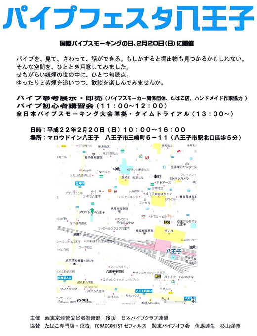 西東京煙管愛好者倶楽部は2011年の国際パイプスモーキングの日の2月20日(日)にマロウドイン八王子(八王子市三崎町6−11)でパイプフェスタ八王子を開催致します。日本パイプクラブ連盟が後援し、パイプの展示即売や初心者講習会、タイムトライアル(PCJ規則準拠)などを開催します。 パイプ喫煙愛好家や、これからパイプに挑戦したいとお考えの方は気軽にお越し下さい。 詳しくは西東京煙管愛好者倶楽部HPをご覧下さい。http://www.pipe.gr.fm/ ![]() |