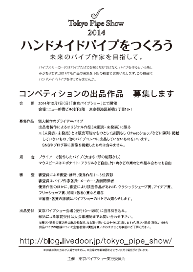 本年も恒例のハンドメイドパイプのイベントが開催されますのでお知らせします。会場がわかりにくいので気をつけてお越しください。喫煙可能な会場です。 会期2014年12月7日(日)10:00〜16:00 入場無料会場ニュー新橋ビル東京都港区新橋2丁目16-1地下2階 最寄駅JR山手線・東京メトロ銀座線・ 都営浅草線・ゆりかもめ「新橋」駅公式ブログhttp://blog.livedoor.jp/tokyo_pipe_show/ |