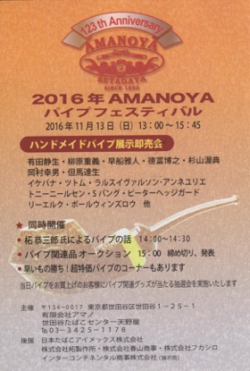 世田谷たばこセンター「天野屋」が恒例のパイプフェスティバルを下記のように開催します。ハンドメイドパイプの展示即売会も行われすます。パイプを愛する皆様はこの機会に是非お寄りください。 [↓クリックすると拡大表示します。]