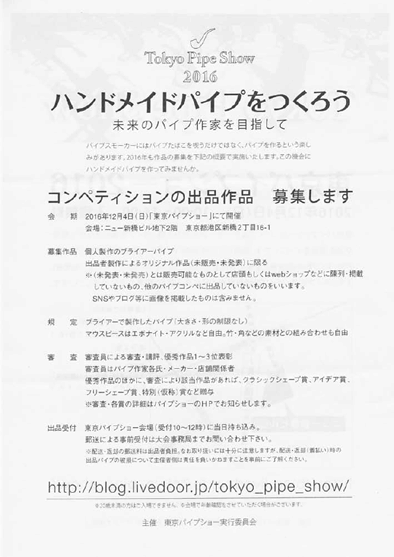 今年も「東京パイプショー」も開催いたします。アマチュアのハンドメイドパイプコンペティションやパイプ作家の作品展示、パイプ関連品のオークション、喫煙具関連に情報提供、パイプ好きの方のためのイベントです。