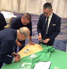 会議開始に先立ってこの9月10日に亡くなられた砂山有生連盟副会長に黙とうを捧げ、哀悼の意を表した。 開会冒頭梶浦会長から挨拶があり、第44回大会は主管クラブのGun Room of Tokyoの今井龍也名誉会長(連盟常任理事)、大石良明会長をはじめとする関係者の方々の尽力により、競技参加登録200名・パーティ参加者250名(中国からの参加者6名を含む)を予定する盛大な大会となった。来年の世界大会を展望し、受付・登録に初めてバーコードシステムを導入した。世界大会の団体戦には日本代表としてあらかじめ5名を登録する。明日の大会の個人戦1,2位入賞者を優先的にこのメンバーとする。残り3名は過去5年間の競技成績などを勘案し、常任理事会にて決定する予定。