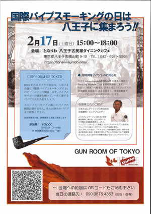 日本パイプクラブ連盟加盟の私共GUN ROOM OF TOKYOが、八王子ケムカム様とコラボ致しますイベントのお知らせをさせていただきます。 僕たちパイプスモーカーにとって2月と言えば、ええ、国際パイプスモーキングデーですよね。 昨年も八王子となりわ様にて開催いたしましたこのイベント、今回はゆったりとくつろげるお時間を設定いたしました。