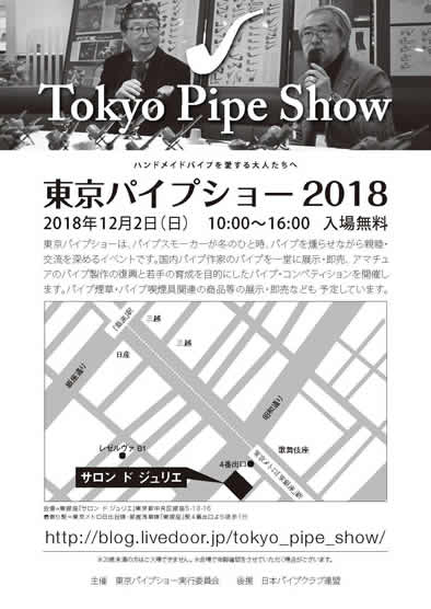 今年も「東京パイプショー」も開催いたします。 東京パイプショーは、パイプスモーカーが冬のひと時、パイプを燻らせながら親睦・交流を深めるイベントです。国内パイプ作家の新作パイプを一堂に展示、アマチュアのパイプ製作の復興と若手の育成を目的にしたパイプ・コンペティションを開催します。パイプ煙草・パイプ喫煙具関連の商品等の展示・紹介なども予定しています。 詳細は下記の通りです。