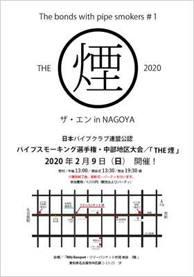 「なごやかパイプクラブ」「静岡パイプクラブ」「金沢パイプクラブ」3クラブ共催で「パイプスモーキング 選手権・中部大会」を、「THE 煙」と名付け、愛知県名古屋市にて開催することを報告させて頂きます。 喫煙環境が厳しくなる中、最初で最後になるかも知れませんが・・。共に楽しく煙を上げ、宴を楽しめればと 思っています。皆様の参加を心待ちに準備を整えていきます。