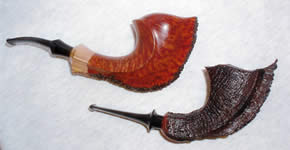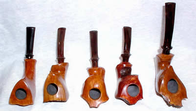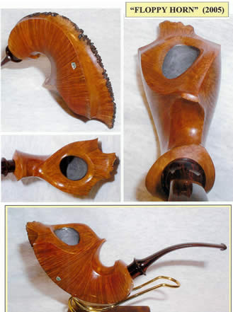 次に掲げる一連のパイプは徳富がいかにシェープで遊ぶかを示している。2003年の春には、彼は微妙に非対称なデルタ・ホーンをわずかに捻ったボディで制作している[写真左]。その後、彼はフォルムを異なる方向へ押したり突いたりしている。最初に彼は、テールをカールさせフロントをしなやかに変えた[左より2番目]。そして、頭頂部を丸くし山羊ヒゲを付け加えた[センター]。次いで、デルタの三角フェースを復活させたが、山羊ヒゲを残したまま輪郭を柔らかく形作った[右より2番目]。この一連の進化は2004年の12月に最高潮に達し、波うつラインと非対称なフォルムがブライアをクレイ(粘土)のように柔らかくみせる、驚くほど柔軟なホーンが出来上がったのである[右]。