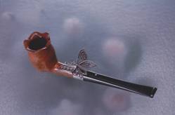 リチャードさんは「半年待って下さい。お返しにあなたに似合うパイプをお作りしてプレゼントします」とおっしゃったの。そうしたら彼が本当に作って半年後に送ってきて下さいました。ダンヒル社にパイプを注文したら、普通は3年待ちだという話を聞いていたので、とても嬉しゅうございました。そのパイプがこれですの。ボウルの部分を五分咲きのバラの花のように形作った素敵なパイプです。