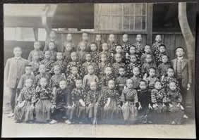 学制発布50周年紀年の写真だから、大正11年、僕が小学2年生の時です。校長、クラスメイトと一緒です。下から3列目、左から5番目の頭が大きいのが僕です。頭の鉢が大きいので「福助」という綽名でした。今では、この写真の誰も僕以外に生き残っているのはいないね。戦死したクラスメイトが多いです。この前の戦争(大東亜戦争)ではなく、満洲事変です。