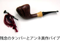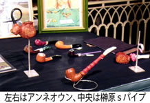 展示してある自作のパイプにゆっくりと進んだアンネさん、「私が買いたい」と冗談とも付かない発言。ここに新たな伝説が生まれた。ホとヒの中間音、ホ/ヒ、ホ/ヒ、ホ/ヒと笑うのは前述のデンマーク語の特性か?何かマジックでも始まるかの雰囲気を醸し動き出したアンネさん。オウンパイプを袋から取り出し、スタンドを組み立ててディスプレイ。2本の「喫えないパイプ」。