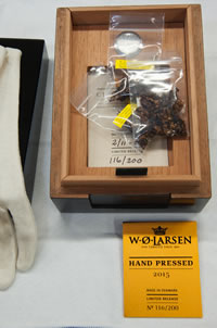 今年のショーの目玉の一つは、開催3日前に財務省の認可が下りた100gで14万円するパイプ煙草「W.O. Larsen 2015 Limited Release Hand Pressed Pipe Tobacco 3.5oz」。世界限定で200箱、シリアルナンバー入りヒュミドールに入っています。国内販売は十数個のみです。入手可能と聞いて急きょ、東京パイプショーにて吸おう、という企画を立てて、一人あたり3gでの有料試喫会を実施しました。