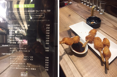 照明のせいで読みにくい?そういう文句を言いたい方は現地へ行って確認してください。ちなみに、私は串カツをいただきましたが、衣がサクサクで、ソースがちょっとスパイシーでいいお味でした。ただ、串カツを食べ過ぎて、お店ご自慢のカレーが入らなかったのが、なによりの後悔でございます。