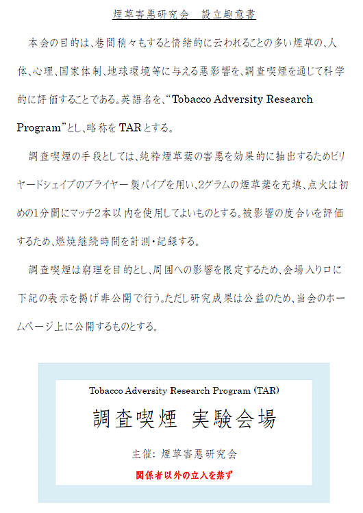 某日、引用のような団体からメールが到着、実験担当者を募集しているとのこと。若い看護士も同時に募集しているので、実験中に、血圧、血中酸素濃度等を丁寧に計測するサービスもあるらしい。協賛には、煙草業界と嫌煙団体が呉越同舟で名を連ね、今なら若干の寄付をすれば調査業務に携わることができるという。略称がタールという辺りが出来すぎの感があるが、非パブリックスペースで喫煙に専念すれば公益に資するとは甚だ魅力的である。しかも嫌煙団体に目を付けられにくい「調査喫煙」という形態を取っているところが心憎いではないか。迷惑メールに分類され日数が経ってしまったため返事を出しても不達、検索してもそんな団体は引っかからない。