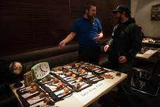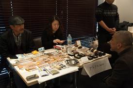 開場の午前10時には常連のパイプスモーカーや、お目当てのパイプ作家のブースで新作パイプを購入するため、早めに来た方々で賑わいます。パイプコンペティションの一般投票券を受け取り、作家ブースや出展ブース前で顔見知り同志が挨拶を交わす、毎年お馴染みの光景もいつも通りに広がり、紫煙の煙もあちらこちらで見られました。今年は来場者も午前中はスロースタートで、前年よりもやや来場者が少なかったようですが、毎年ぎっしりの会場でしたので、ゆったり楽しめた、とのお声もいただけました。会場では国内の有名パイプ作家らが最新の作品を並べ、パイプメーカー・喫煙関連団体などのブースでは、パイプ煙草や喫煙具の展示などを行っていました。パイプコンペティションの受賞経験者もブース出展しており、槇山良平、堂本良平、小坂怜、國友崇史の各氏の若手のブースも賑わっていました。また米作家のネイト・キング(Nate King)氏が初参加されて出展。パイプスモーカーの人気をさらっていました。