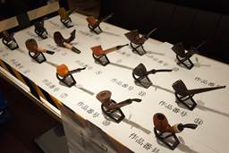ハンドメイドパイプパイプ・コンペティションでは今年、14本のパイプが出品されました。審査はフリーハンド部門で、一昨年の順位制からデザイン性を競う造形賞と技術力を評価する技能賞の二つに分けましたが、今年の出品パイプもデザイン性に優れ、また、完成度の高いパイプが多く見られました。クラシックシェイプ部門では関東パイプオフ会が発起人となった「桑原進一賞」での審査となりました。