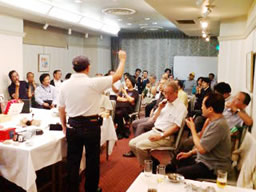 7月22日当日は大盛況で、会場のテーブルを取っ払って催された。40名近くの参加で、「今日の隆盛、まことに結構なことです」と世話人・梶浦恭生さんのニコニコ顔がすべてを物語っていた。