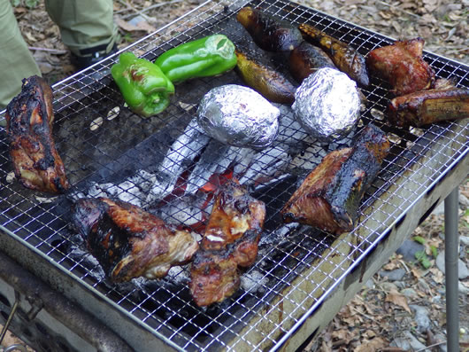 若手の参加者が2台のBQコンロで早速火起こし。すぐに焼けたソーセージを頬張りながら、各自持参のマイカップでまず冷えたビールで乾杯。次いで牛肉、玉葱、野菜、スペアリブと手際良く焼いていく。