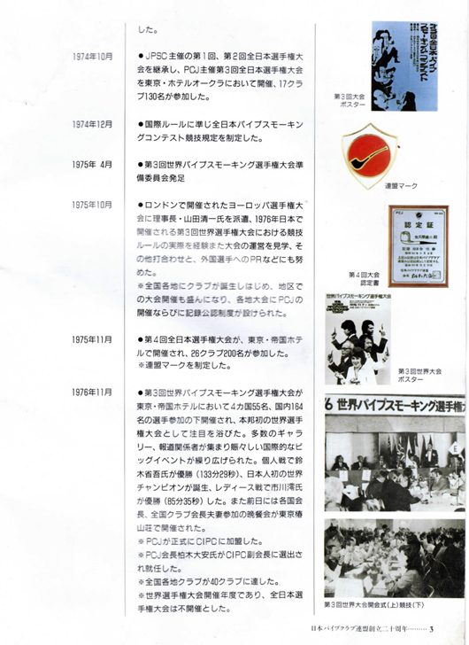 また日本の正式なCIPCへの加盟手続きは1976年の第3回世界パイプスモーキング選手権大会開催時のCIPC総会で行うことが内定しました。正式加盟が3年後となったのは当時、日本には個別クラブのJPSCがあっただけで、国内の諸クラブを統括して日本を代表するナショナルクラブがまだ誕生していなかったからです。
