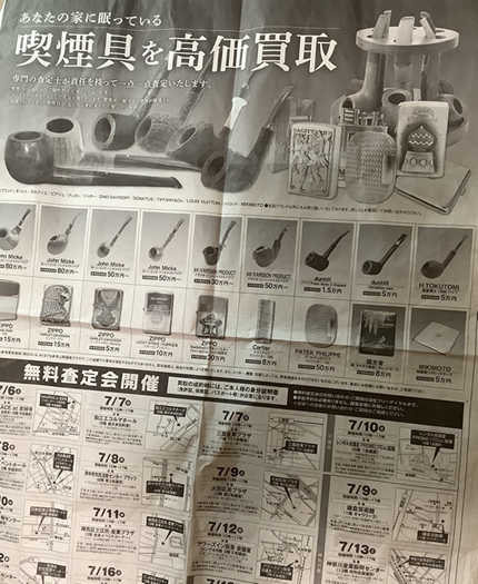 日経を購読している一流企業役員やビジネスマン諸氏の中には、お父さんやお爺さんが大切にしていたハンドメイドの高価なパイプを形見として貰っている方が、かなりいると思う。 ご自身はパイプを嗜まないから中古パイプの価値がわからなくとも、新聞広告でヨーン・ミッケのパイプが80万円〜、イバルソンが50万円〜、ダンヒル、徳富で5万円などと具体的に値付けしてあれば、 「押入れの中でずっと眠らせていても仕方がない。買い取ってもらおうか」と思うのは自然な流れだ。