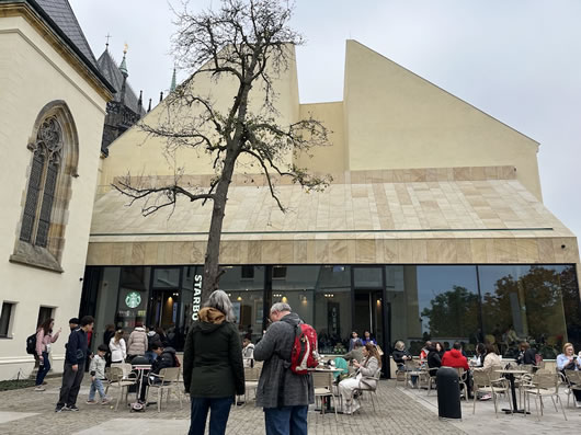それらに加えて、プラハ訪問の機会があれば、ぜひ立ち寄ってもらいたいのは、プラハ城内に開設されているスターバックスカフェである。「世界でいちばん美しい場所にあるカフェ」と言われている。世界中、どこに行ってもマックとスタバはあるが、パリでもバルセロナでも、われわれは入ったことはない。
