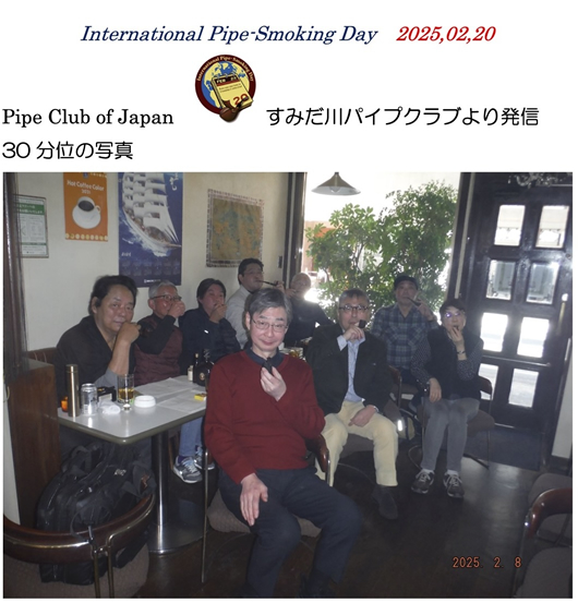 2025年2月20日の国際パイプスモーキングデー(“IPSD” =International Pipe Smoking Day)に際し、日本パイプクラブ連盟(PCJ)傘下の各クラブ、個人のパイプ愛好家がIPSDの趣旨に賛同してパイプスモーキングデーを祝う写真が送られてきましたので掲載します。