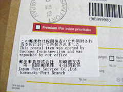 しかし、この小包、税関で「開封」してある旨記されていた。大きな箱に「パイプ・クリーナー」と印刷された品名で税関もナーバスになったのだろうか。有名芸能人の覚せい剤所持が次々に問題になっている昨今、パイプという単語がひっかかったのか、「ひょっとして大麻か、薬物か」と疑われ、一応検品されている。