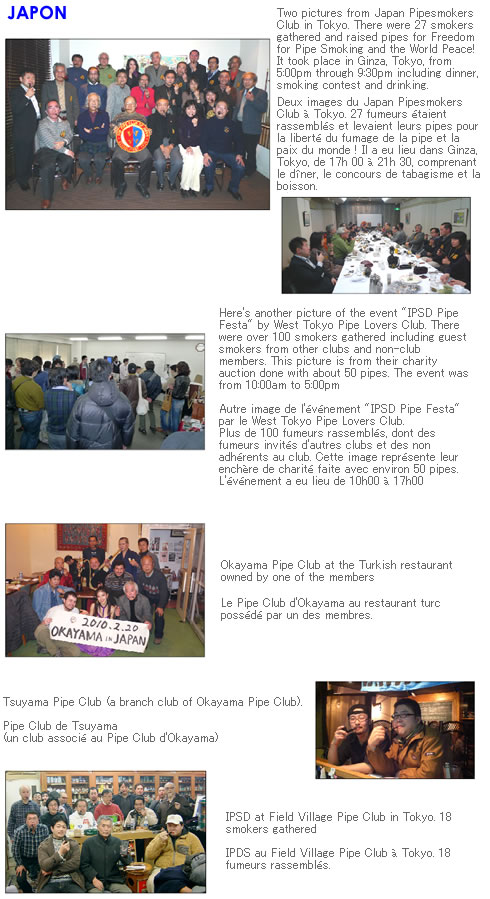 Some sent photographs of their gatherings to us: Japan, Ukraine and Union of the Pipe Clubs of America. Moreover, Vernon Vig has benefitted from the Pipe Show of Saint Louis to present its association to the visitors and the local press spoke about it. |