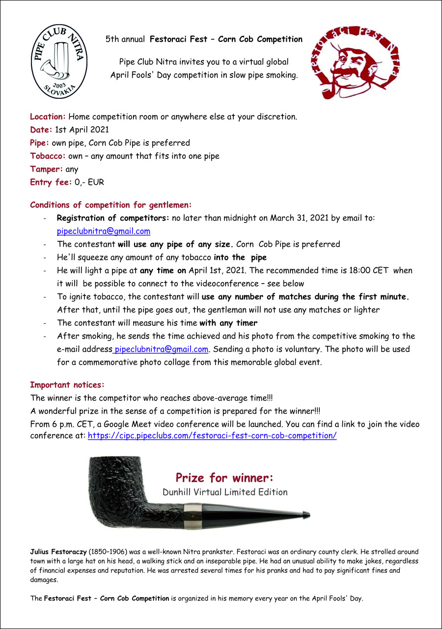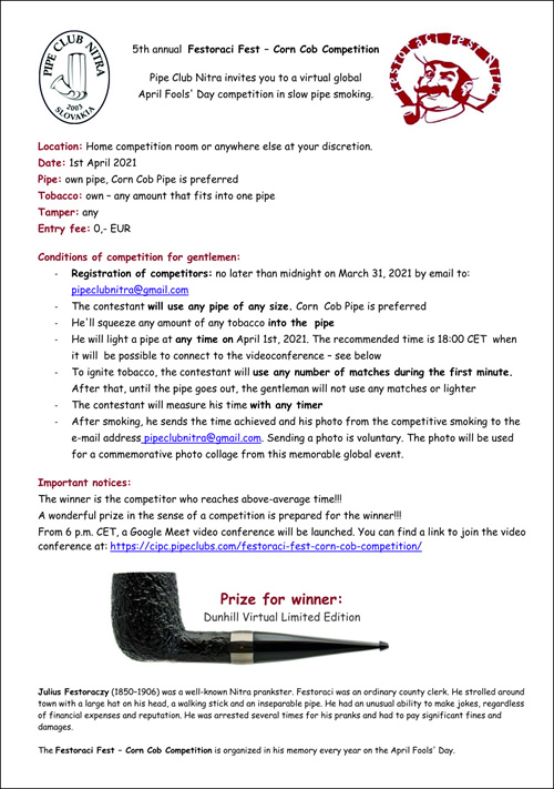スロヴァキアの国際パイプクラブであるニトラ・パイプクラブより、4月1日のエイプリルフールにちなんで、主にコーンパイプによるロングスモーキング選手権大会を開催するので、奮って参加を乞う旨の招待が日本パイプクラブ連盟に届きました。